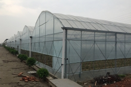 該產品由基礎、框架立柱,頂部拱管三大部分組成。點式獨立基礎,使大棚根基牢固;立柱采用熱鍍鋅方管,大大增強抗風抗雪強度;頂部由熱浸鍍鋅鋼管排列成平滑圓弧形,牢固兼美觀。同時天溝采用2mm厚熱鍍鋅板冷彎成型,容量大,排水及時;頂部天溝處和大棚四周均設置搖膜通風系統,是大棚內部氣流通暢。此產品可根據需要實現相關配套設施,以便達到更理想的效果,如外遮陽系統、內遮陽保溫系統、降溫系統、加溫系統、噴滴灌系統等。