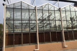 文洛式玻璃溫室為一跨三尖頂、雙坡面小屋頂桁架結(jié)構(gòu)、多雨槽、具有美觀、吊掛能力強(qiáng)、透光性好、空間大、機(jī)械性能強(qiáng)等優(yōu)點(diǎn)。